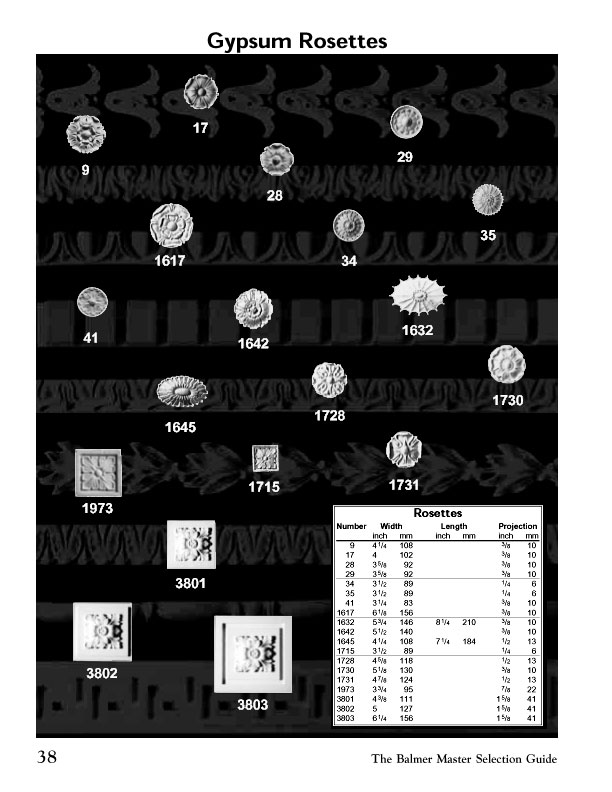 The Balmer Studios Gypsum Rosettes 9 , 17, 1617 , 28 , 29 , 34 , 35 , 41 , 1642 , 1632 , 1645 , 1728 , 1730 , 1973 , 1715 , 1731 , 3801 , 3802 , 3803