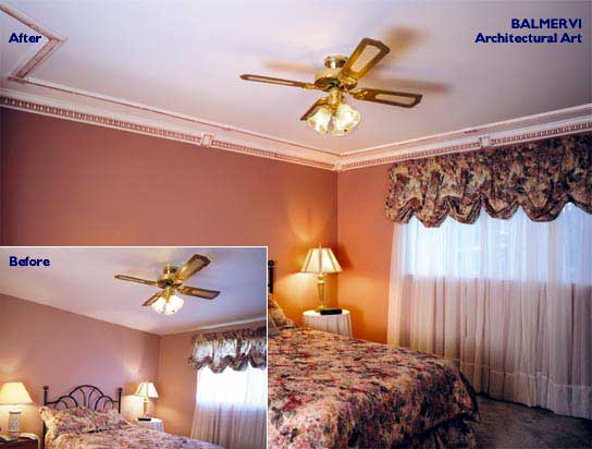 Bedroom - Before & After: Featuring the T300 Egg & Dart cornice with designer miter blocks and a ceiling panel made from M550 Adams Flute decorative moulding and B501 decorative corners.